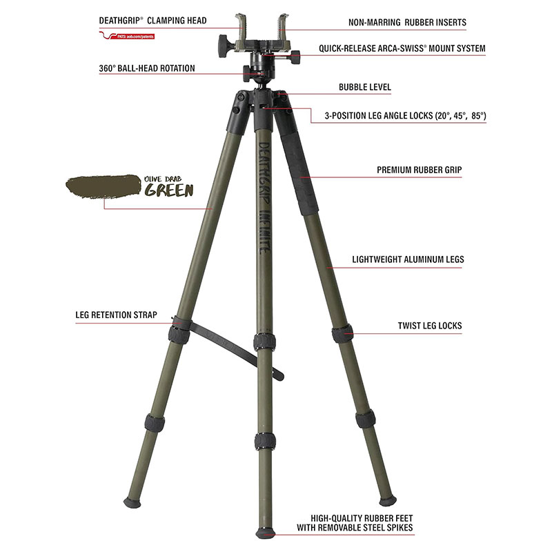 A DeathGrip Infinite sorozatot többfunkciós állványplatformnak tervezték, Arca-Swiss® rögzítési rendszerrel, amely lehetővé teszi az optika és a fényképezési helyzetek közötti gyors váltást. A nagy átmérőjű alumínium lábakból és egy teljes méretű DeathGrip fejből készült DeathGrip Infinite AL úgy lett kialakítva, hogy kiállja az idő próbáját és maximális sikert adjon a terepen.