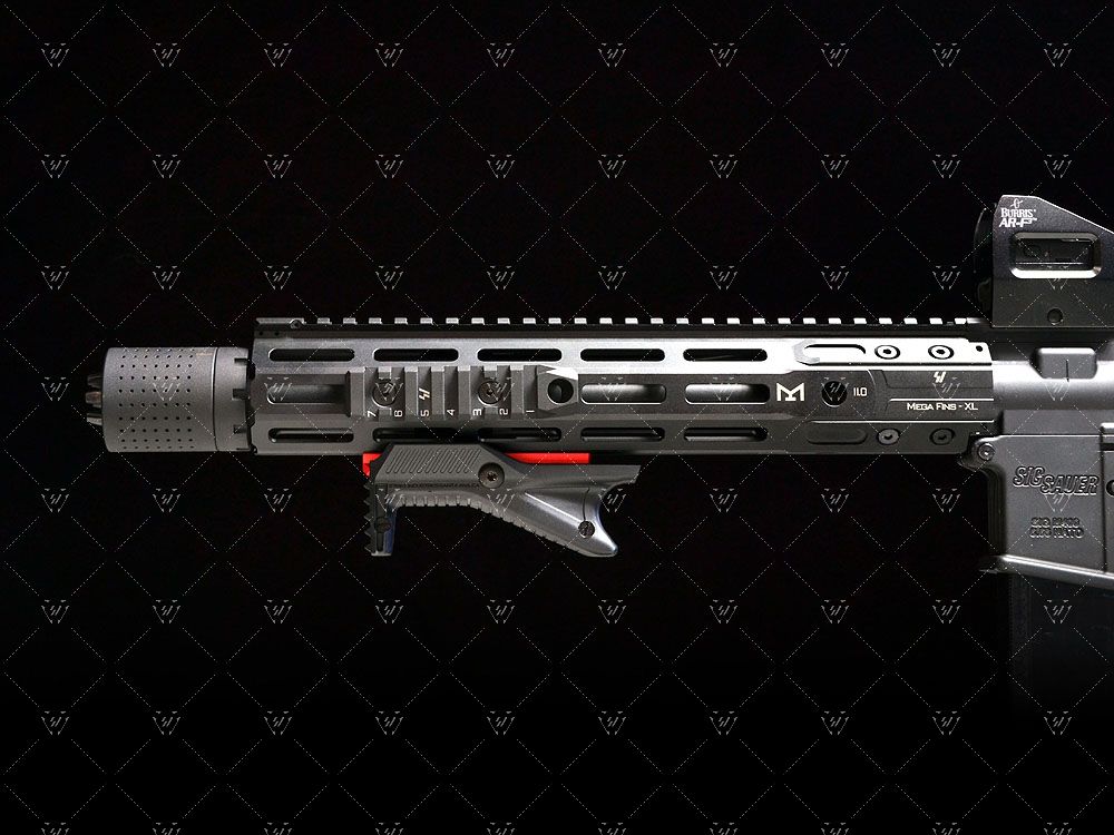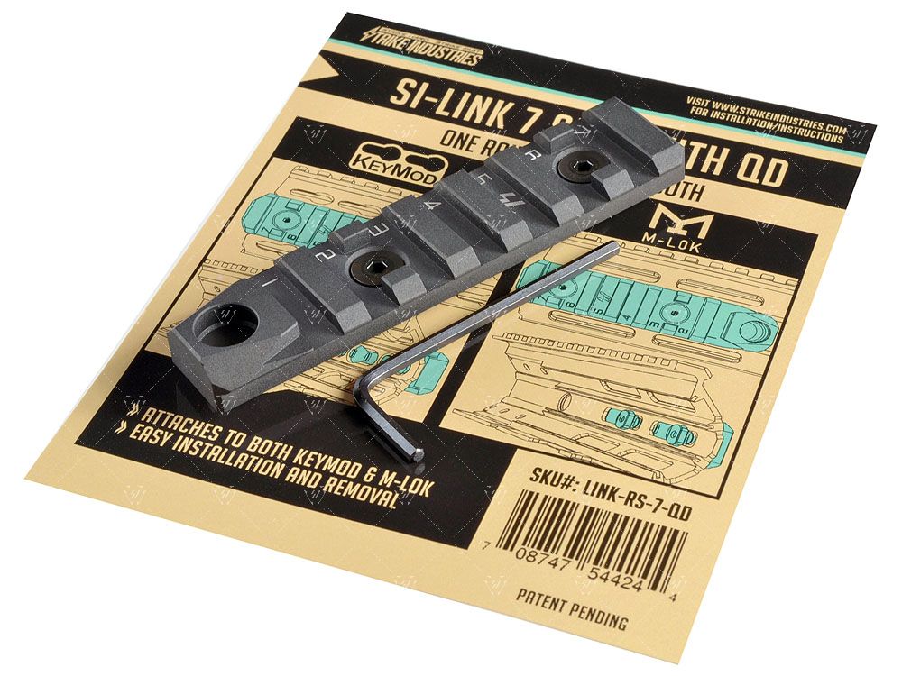A Strike Industries LINK rögzítőrendszer a régóta fennálló KeyMod vs. MLok kérdésre adta meg a végső megoldást: egy kettős interfész kialakítást, amely mind az MLok, mind a KeyMod rendszerrel kompatibilis. Ugyanazt a hardvert használja és nincs szükség további alkatrészekre. Ez az alumínium sínrész lehetővé teszi különböző standard Picatinny specifikációjú sínre szerelhető kiegészítők, például függőleges markolatok, lámpák, lézerek stb. rögzítését. A kettős interfészű sínrész ferde végekkel is rendelkezik, hogy csökkentsék az akadásokat és megszüntessék az éles sarkokat és éleket. A sínen kialakításra került egy QD port, melynek segítségével fegyverszíj is rögzíthető, további adapter használata nélkül.