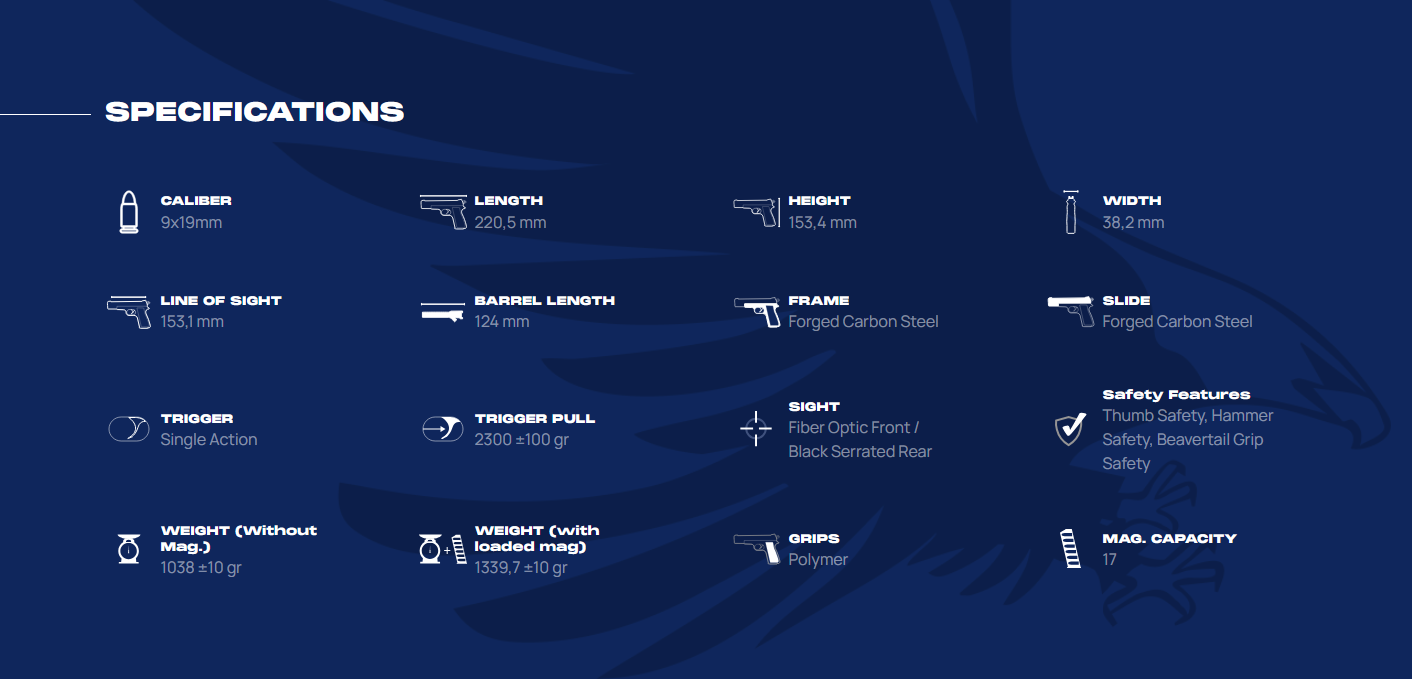 A közismert 1911-es pisztoly modernizált változata 9x19 mm-es kaliberben, két soros, 17 lőszeres tárral, beépített kompenzátorral.
